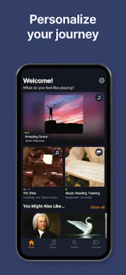 Från dina allra första toner till komplexa improvisationer, flowkey följer din utveckling steg för steg. Nybörjare kan enkelt ta sig an grunderna genom pedagogiska kurser som lär ut notläsning, tangentbordets uppbyggnad och hur man spelar med båda händerna. Erfarna pianister kan finslipa sina färdigheter med fördjupade handledningar inom skalor, ackord och avancerade tekniker. De interaktiva funktionerna erbjuder omedelbar feedback och gör övningen effektiv och givande: 'Loop' låter dig repetera svåra passager tills de sitter perfekt, 'Select a Hand' ger dig möjlighet att öva separata händer, och 'Wait Mode' justerar tempot efter ditt spelande och väntar på att du ska träffa rätt noter – antingen via enhetens mikrofon eller Bluetooth/MIDI. Dessutom kan du med 'Video' se professionella pianister demonstrera varje stycke med markerade noter och fingrar, eller bara 'Just Play' och låta flowkey följa med i takten medan du uttrycker dig fritt.