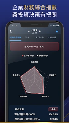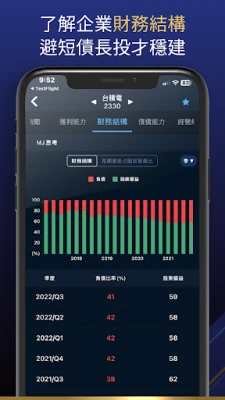 Hur omsätter du då denna finansiella insikt i praktiken? 超級數字力App:s "Finansiella Rapporter Radar" ger en heltäckande bild av företagens hälsa. Den sammanställer data från Taiwans alla börsnoterade företag över fem kritiska områden: kassaflöde, operativ förmåga, lönsamhet, finansiell struktur och skuldtäckningsförmåga. Genom denna unika funktion får varje företags finansiella struktur en tydlig poäng och klassificering. Detta gör det möjligt för användare att snabbt bedöma ett företags styrka eller svaghet, greppa dess verkliga tillväxtpotential och därmed underlätta informerat värdeinvesterande och strategiskt beslutsfattande. Med 超級數字力App får du en kristallklar överblick över marknaden och verktygen för att agera med självförtroende.